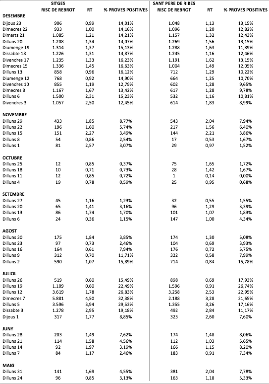 En el cas dels indicadors epidemiològics, el panorama és similar: són considerablement elevats a tots dos municipis, tot i que a Sitges han baixat en els últims dies. El risc de rebrot està en 906 punts (fa una setmana eren 1.252). La velocitat d’expansió (rt) està en 0,99 (estava en 1,33) i la positivitat e les proves arriba al 14,01 per cent, més de dos punts per sota que fa set dies.