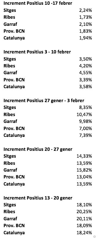 A Sant Pere de Ribes, aquesta setmana hi ha hagut 155 casos confirmats. Es tracta d’un descens considerable respecte la setmana passada (361) i l’anterior (815). D’un augment del 4,20 per cent s’ha passat a l’1,73 per cent en set dies. L’increment de positius a Sitges ha estat 2,24 per cent.