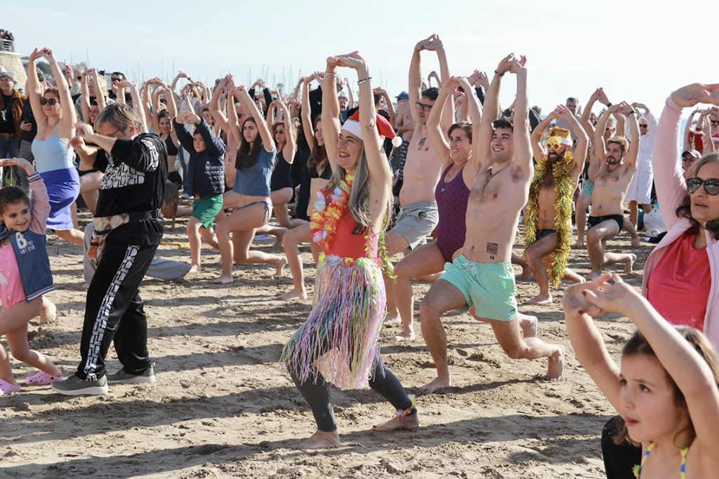 Després d’un intens escalfament dirigit amb música i ball, a tocar de la 13 h ha arribat el moment clau de la festa, amb una capbussada multitudinària que ha estat immortalitzada per una infinitat de telèfons mòbils, tant dels participants com dels centenars de curiosos que omplien la balconada de la platja de Sant Sebastià.