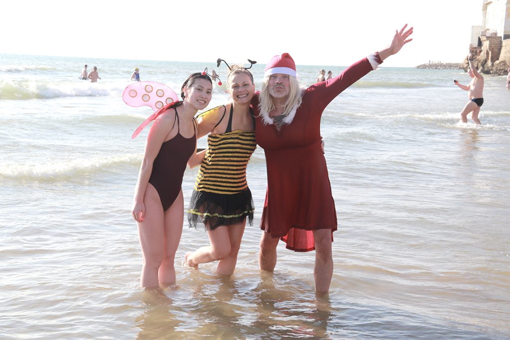 La festa ha anat ‘in crescendo’ a la platja de Sant Sebastià des de poc després de les 11 h, quan han arribat els primers banyistes i diverses disfresses. Barrets nadalencs, lluentons, personatges marins i de còmics han estat els predominants entre els més entregats a una cita “on l’objectiu és compartir amb alegria i música l’inici de l’any amb bon peu”, segons Núria Escarp, directora de Radio Sitges, l’emissora on-line que organitza la Capbussada amb la col·laboració de l’Ajuntament.